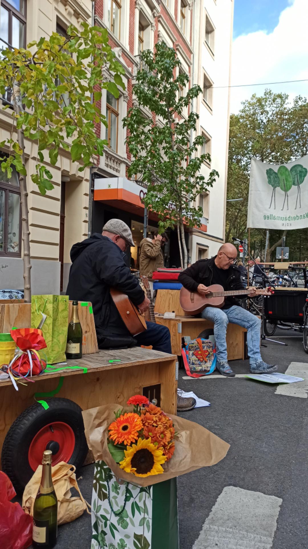 Dank des super Engagements der Nachbarschaft wurde aus der Ankunft dann noch ein richtiges Straßenfest. Es gab Musik, Getränke und etwas zu Essen. Und sogar das Wetter spielte mit und auch die Sonne schaute vorbei. Wir freuen uns, dass die Wanderbaumallee hier nun die nächsten Wochen stehen wird! Danke an alle Beteiligten, Unterstützer*Innen und Anwohner*innen für diesen großartigen Umzug und dem tollen Empfang!