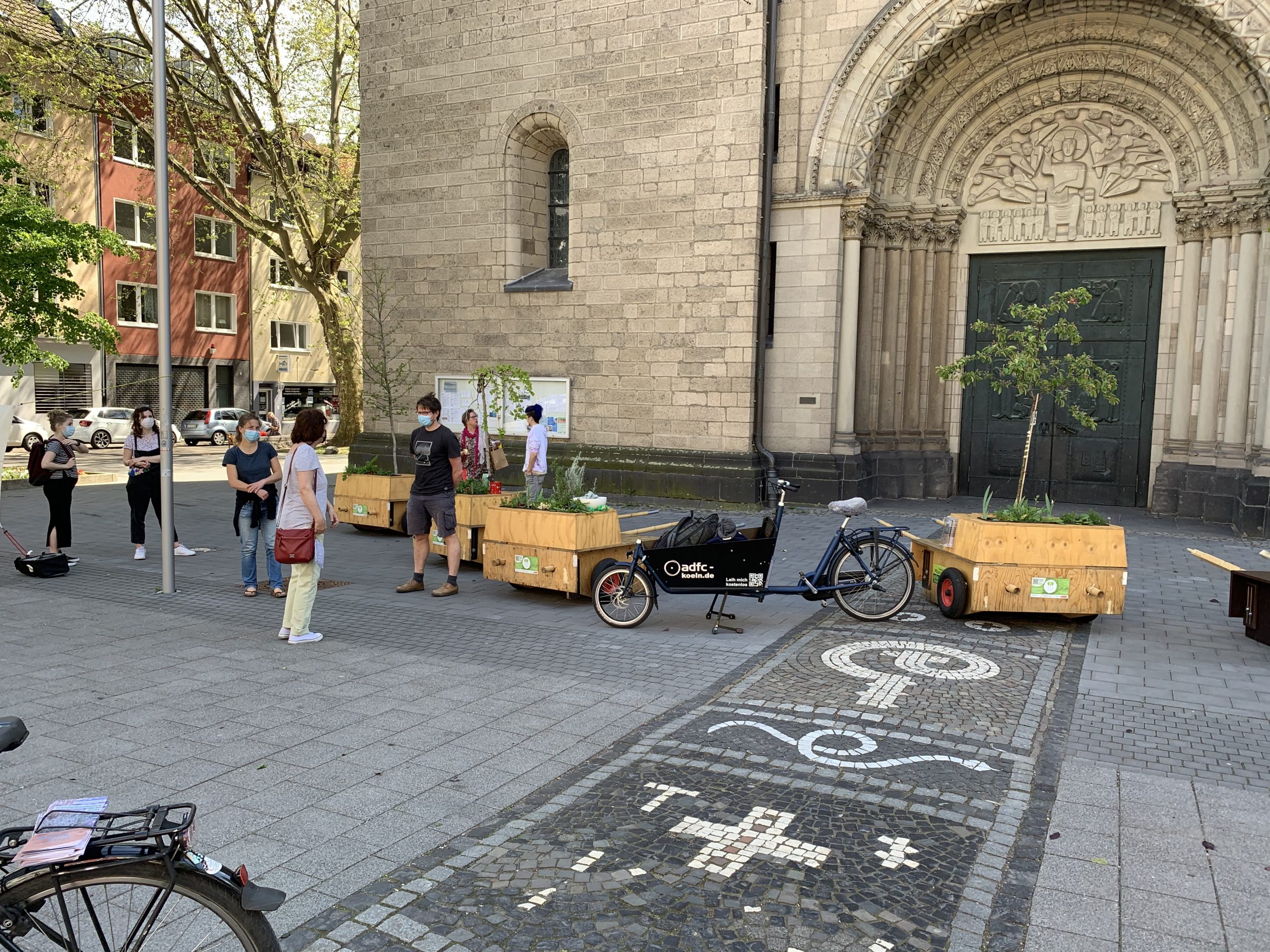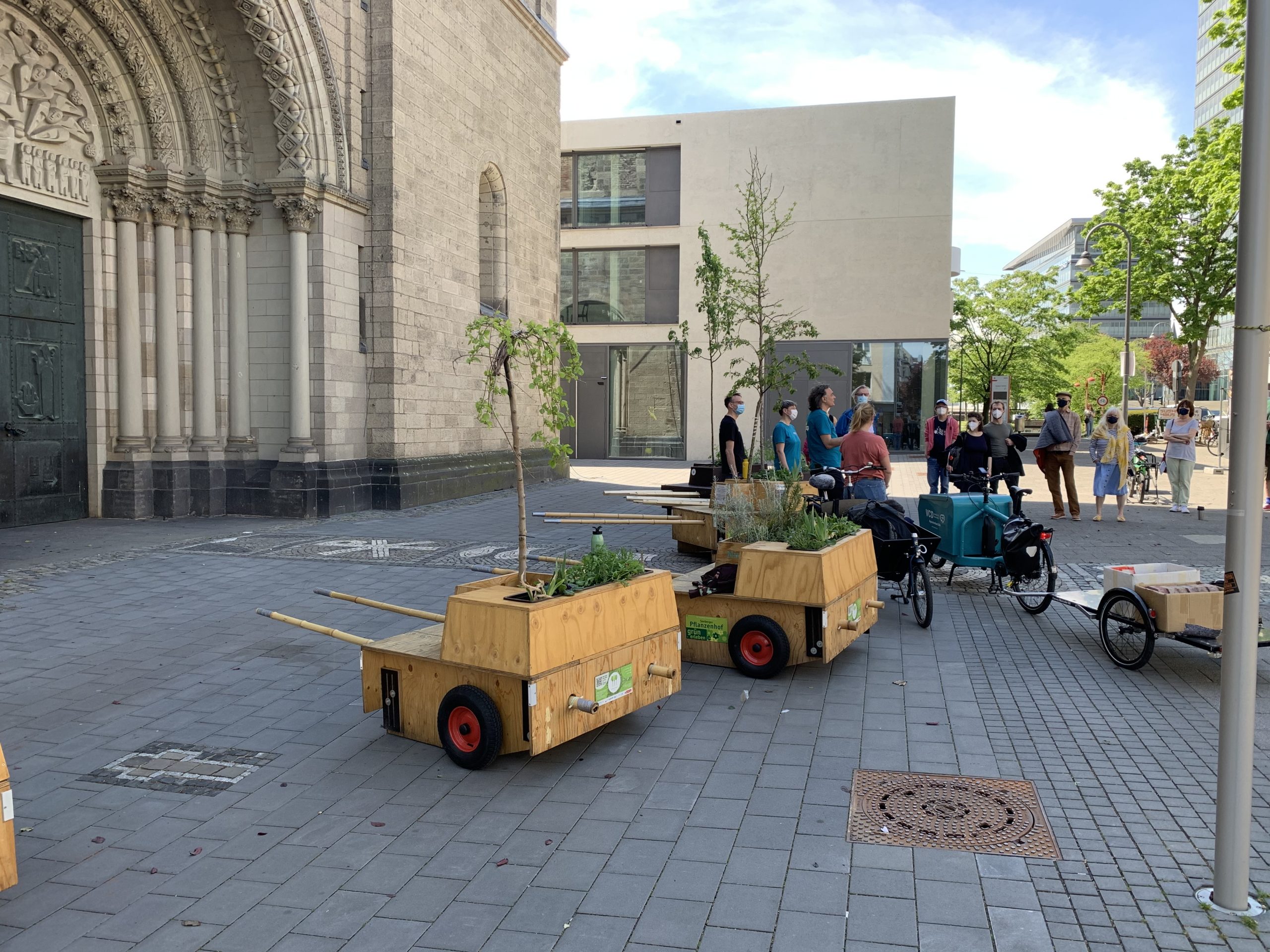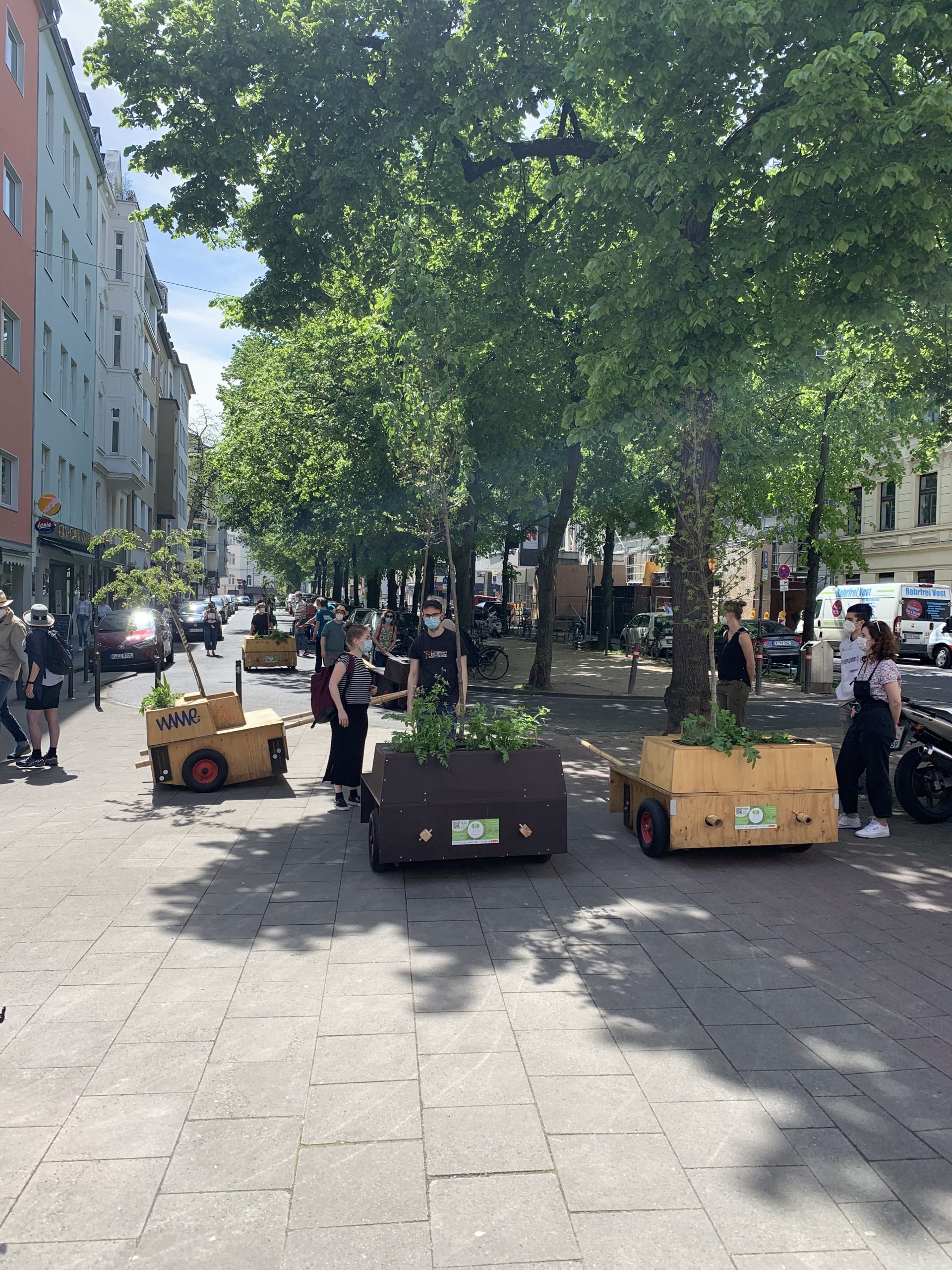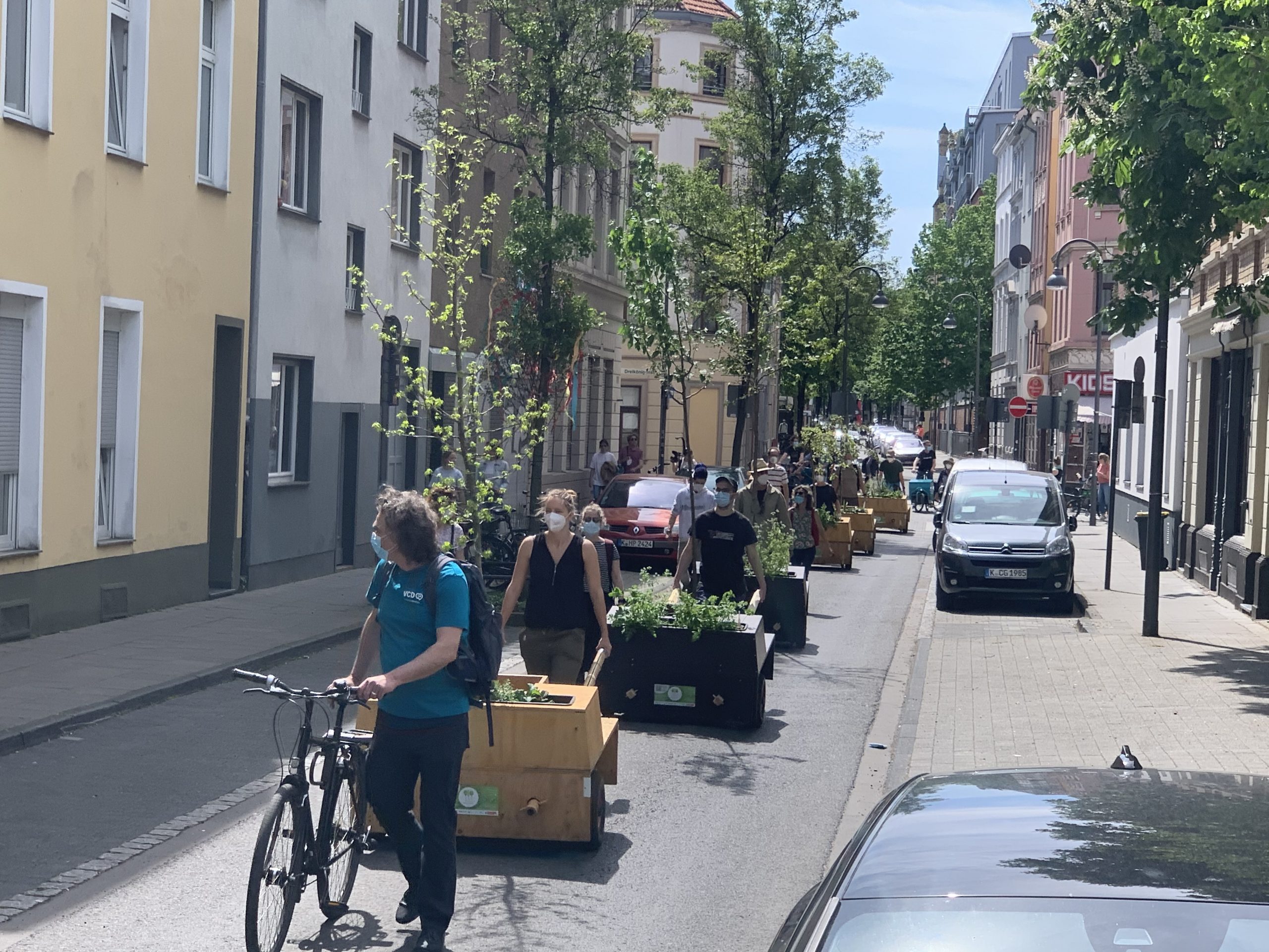 Bei bestem Wanderwetter (Sonne, wenig Wind — wie könnte es anders sein) trafen sich Helfer*Innenaus Deutz und Wanderbaumfreund*Innen in der Südstadt und zogen mit den sechs Wanderbäumen unter der Severinsbrücke hindurch, über den Heumarkt und die Deutzer Brücke zur Deutzer Freiheit. Bei relativ wenig Verkehr verlief die Wanderung — einem sonnigen Spaziergang gleich — sehr angenehm ruhig. Zwischenstopp vor St. Heribert: Wer wandert, muss sich auch stärken, u.a. mit kühlem Nass aus dem neuen Trinkwasserspender der Stadt (https://www.stadt-koeln.de/politik-und-verwaltung/presse/mitteilungen/22136/index.html). Hier stießen Vertreter*Innen aus Politik und Stadtgesellschaft dazu. Zum Auftakt des Greening-Month hielten Anne (Greening Month Projekt), Ralph Herbertz für die Initiative WBA / VCD Köln und Bezirksbürgermeister Innenstadt Andreas Hupke kurze Ansprachen. Schließlich trat die Wandergruppe die letzte Etappe an, um die Wanderbäume auf ihre Standorte in der Tempelstraße / Ecke Adolphstraße, in der Mathildenstraße sowie in der Suevenstraße zu verteilen, wo jeweils zwei Baummodule bis zum 20. Juni stehen werden.