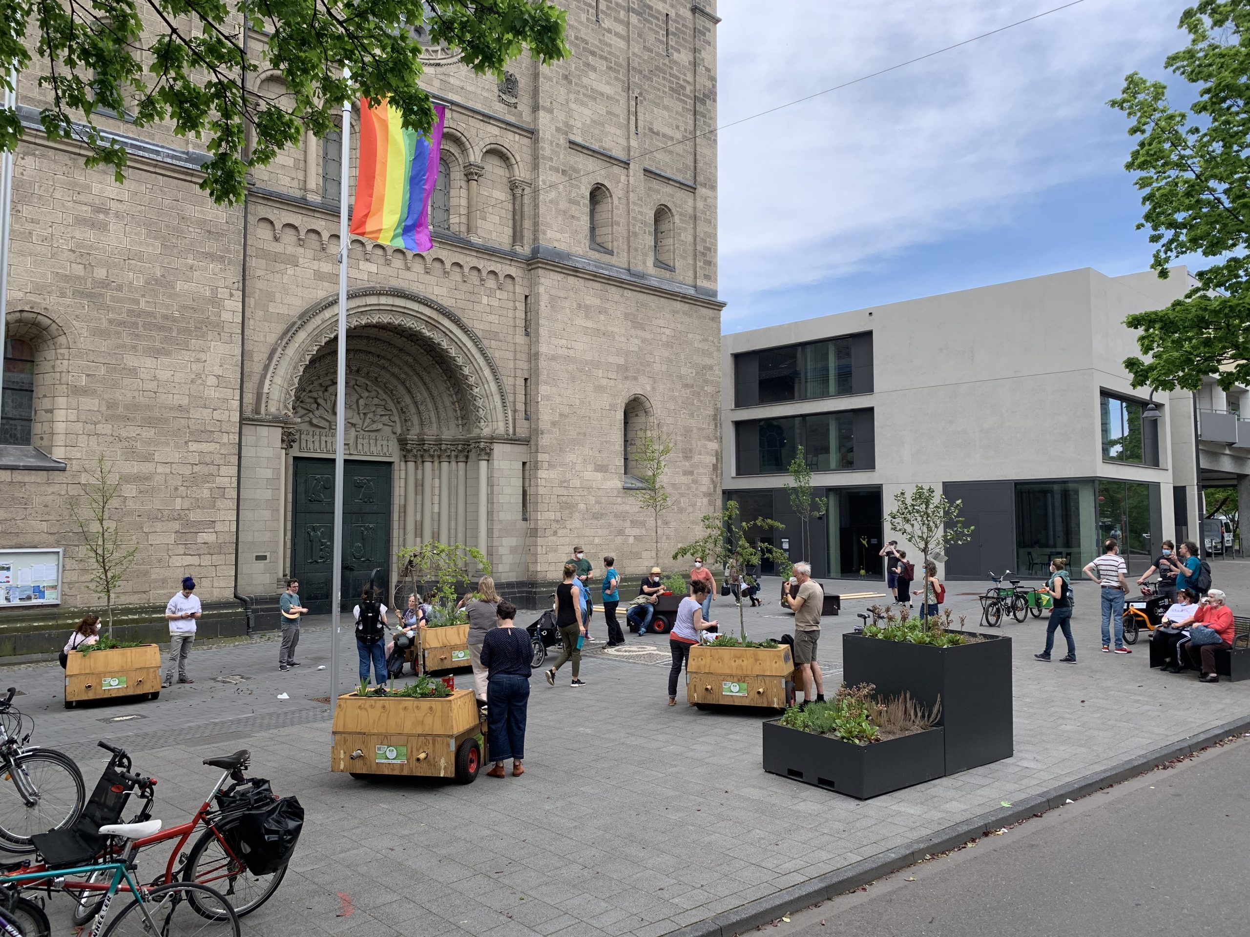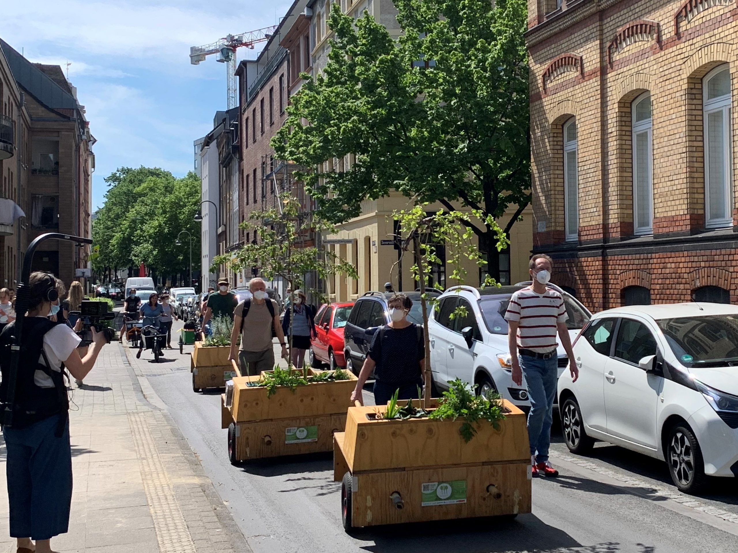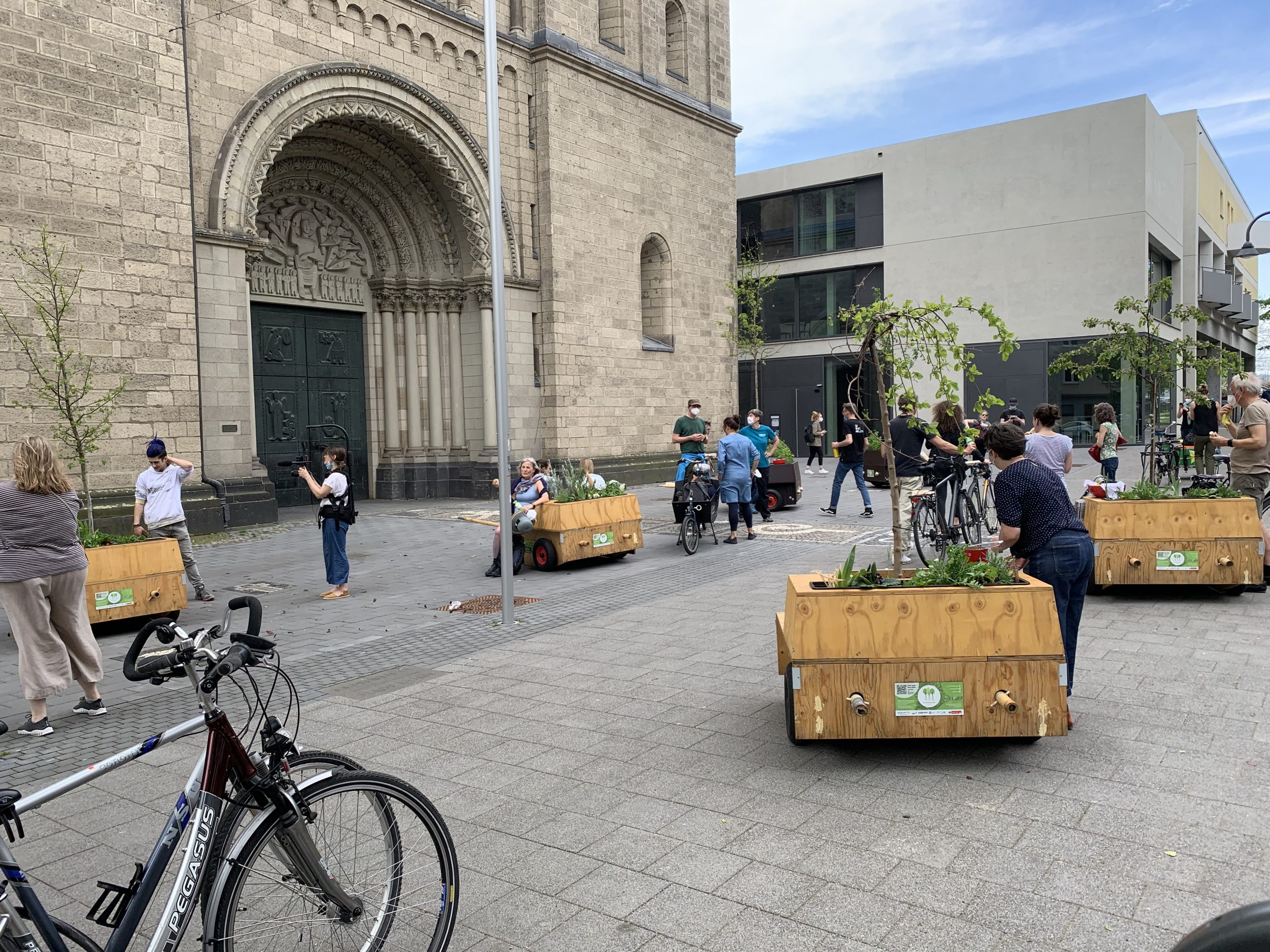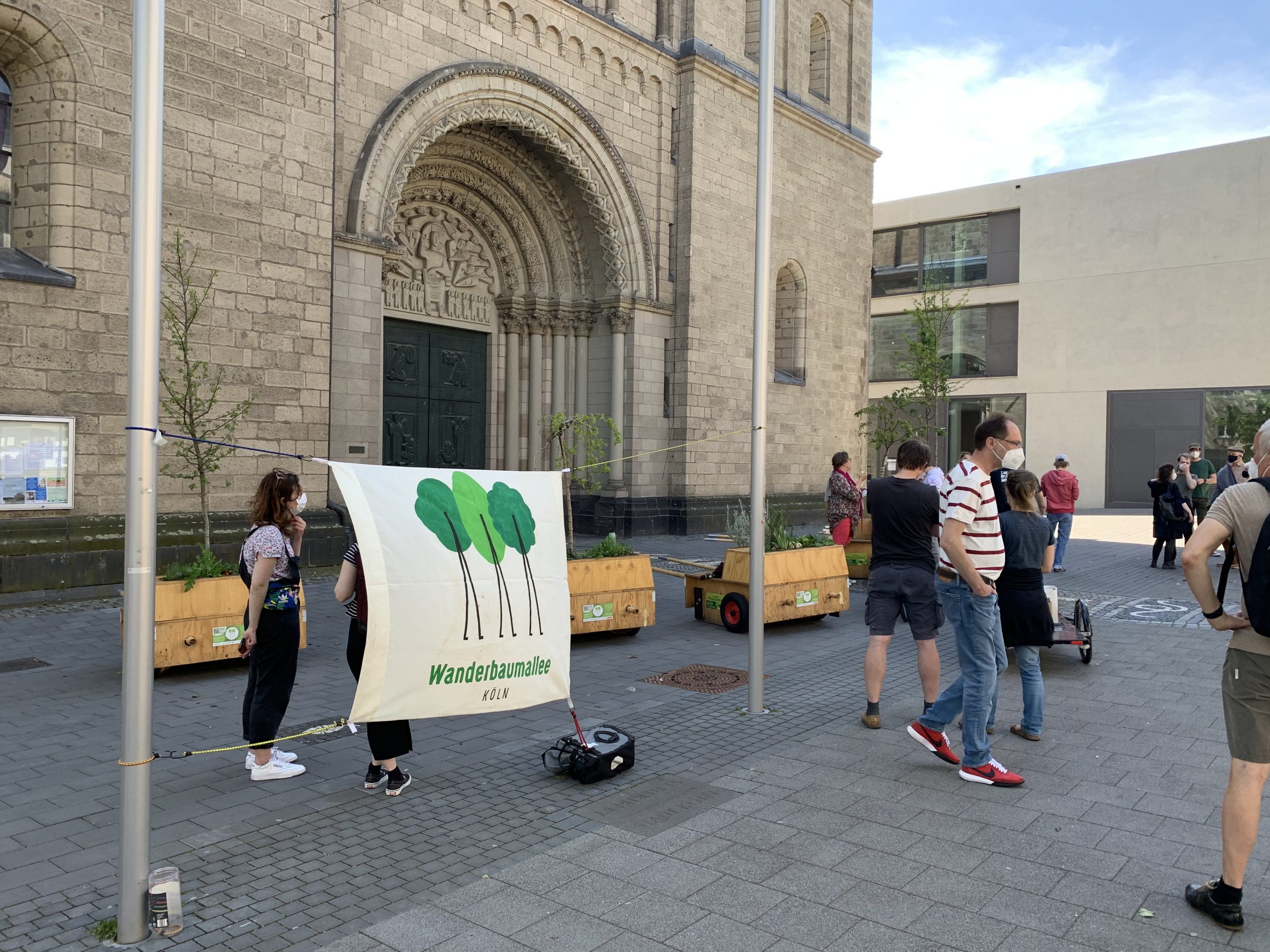 Bei bestem Wanderwetter (Sonne, wenig Wind — wie könnte es anders sein) trafen sich Helfer*Innenaus Deutz und Wanderbaumfreund*Innen in der Südstadt und zogen mit den sechs Wanderbäumen unter der Severinsbrücke hindurch, über den Heumarkt und die Deutzer Brücke zur Deutzer Freiheit. Bei relativ wenig Verkehr verlief die Wanderung — einem sonnigen Spaziergang gleich — sehr angenehm ruhig. Zwischenstopp vor St. Heribert: Wer wandert, muss sich auch stärken, u.a. mit kühlem Nass aus dem neuen Trinkwasserspender der Stadt (https://www.stadt-koeln.de/politik-und-verwaltung/presse/mitteilungen/22136/index.html). Hier stießen Vertreter*Innen aus Politik und Stadtgesellschaft dazu. Zum Auftakt des Greening-Month hielten Anne (Greening Month Projekt), Ralph Herbertz für die Initiative WBA / VCD Köln und Bezirksbürgermeister Innenstadt Andreas Hupke kurze Ansprachen. Schließlich trat die Wandergruppe die letzte Etappe an, um die Wanderbäume auf ihre Standorte in der Tempelstraße / Ecke Adolphstraße, in der Mathildenstraße sowie in der Suevenstraße zu verteilen, wo jeweils zwei Baummodule bis zum 20. Juni stehen werden.