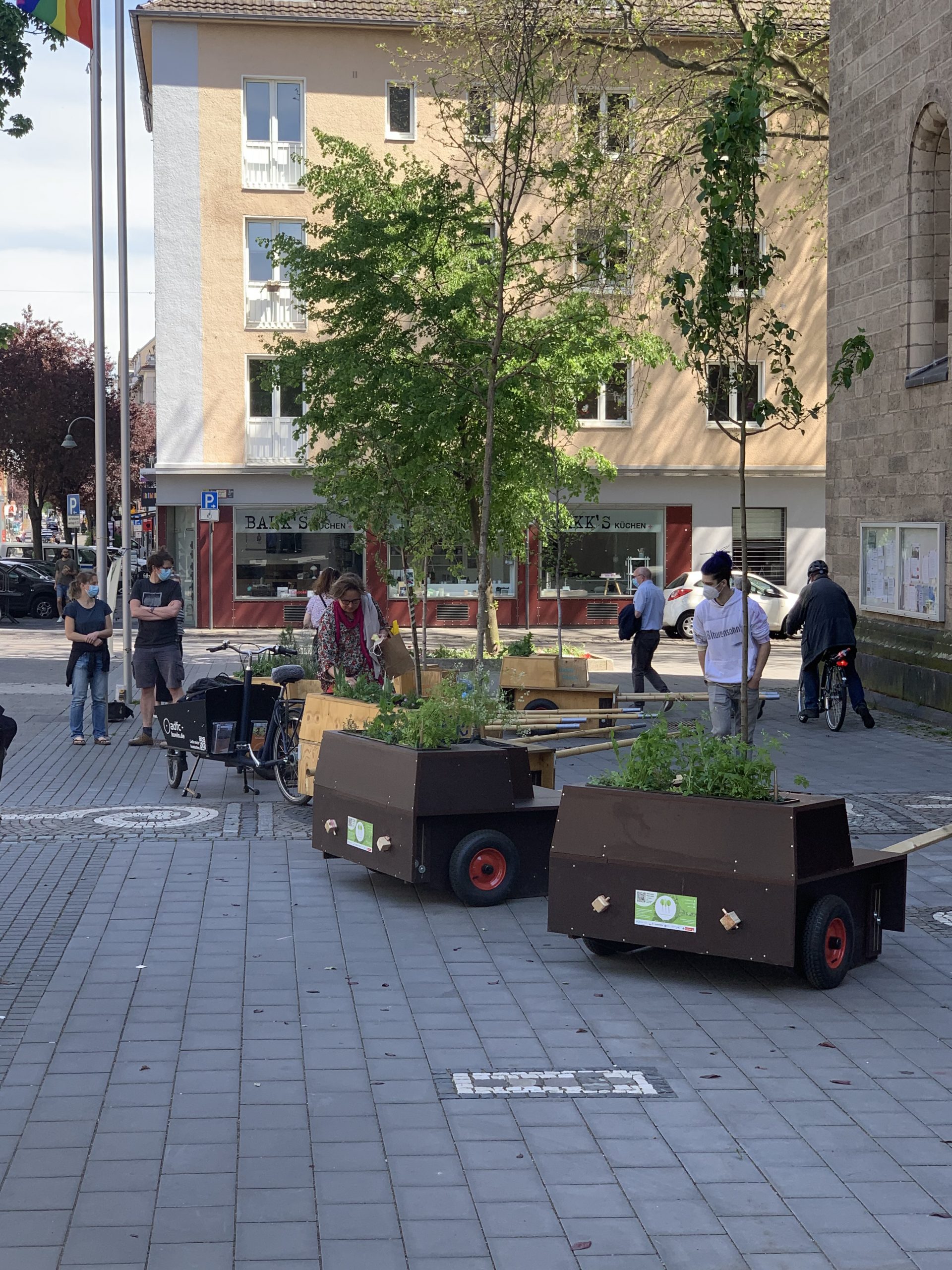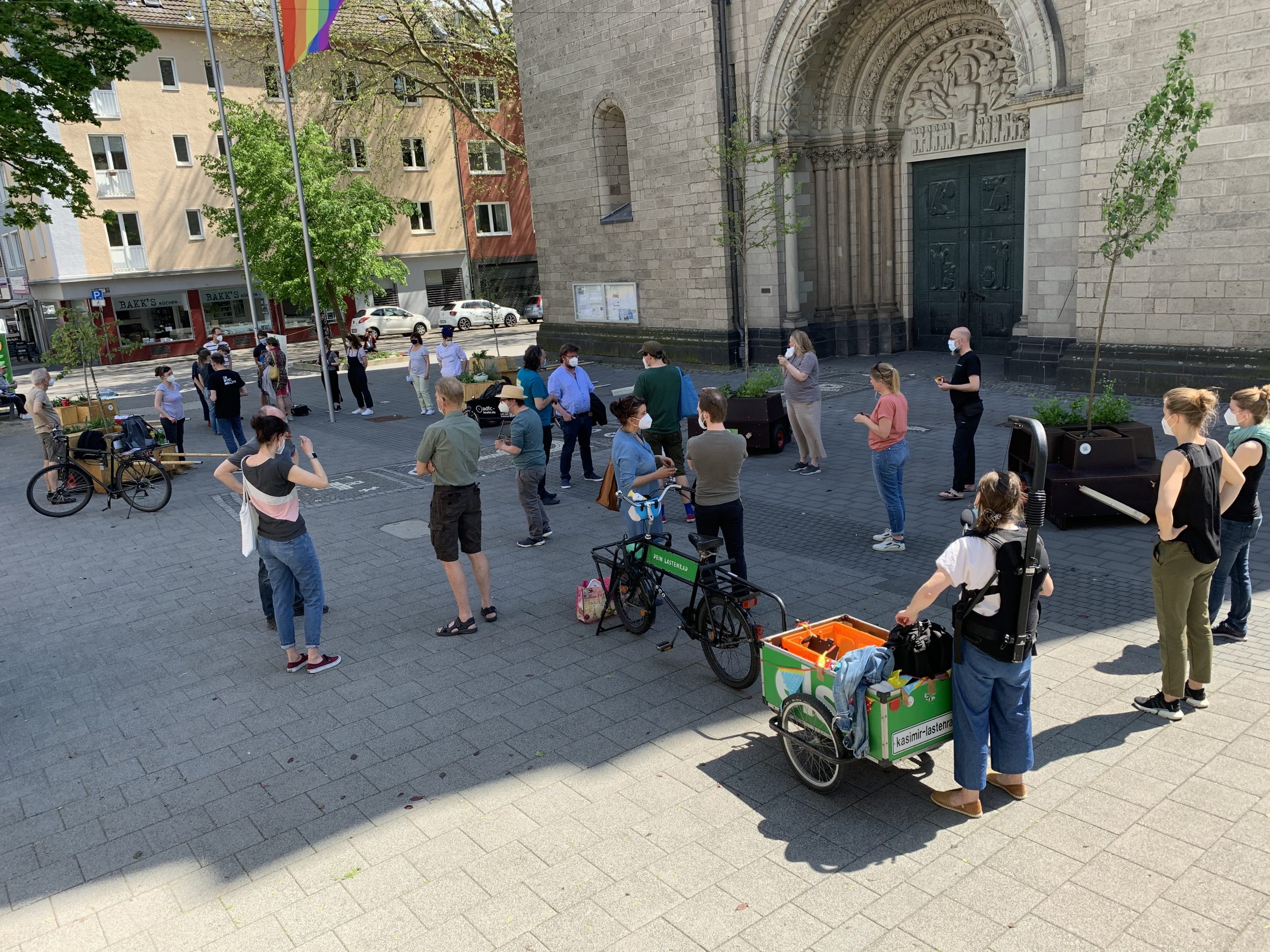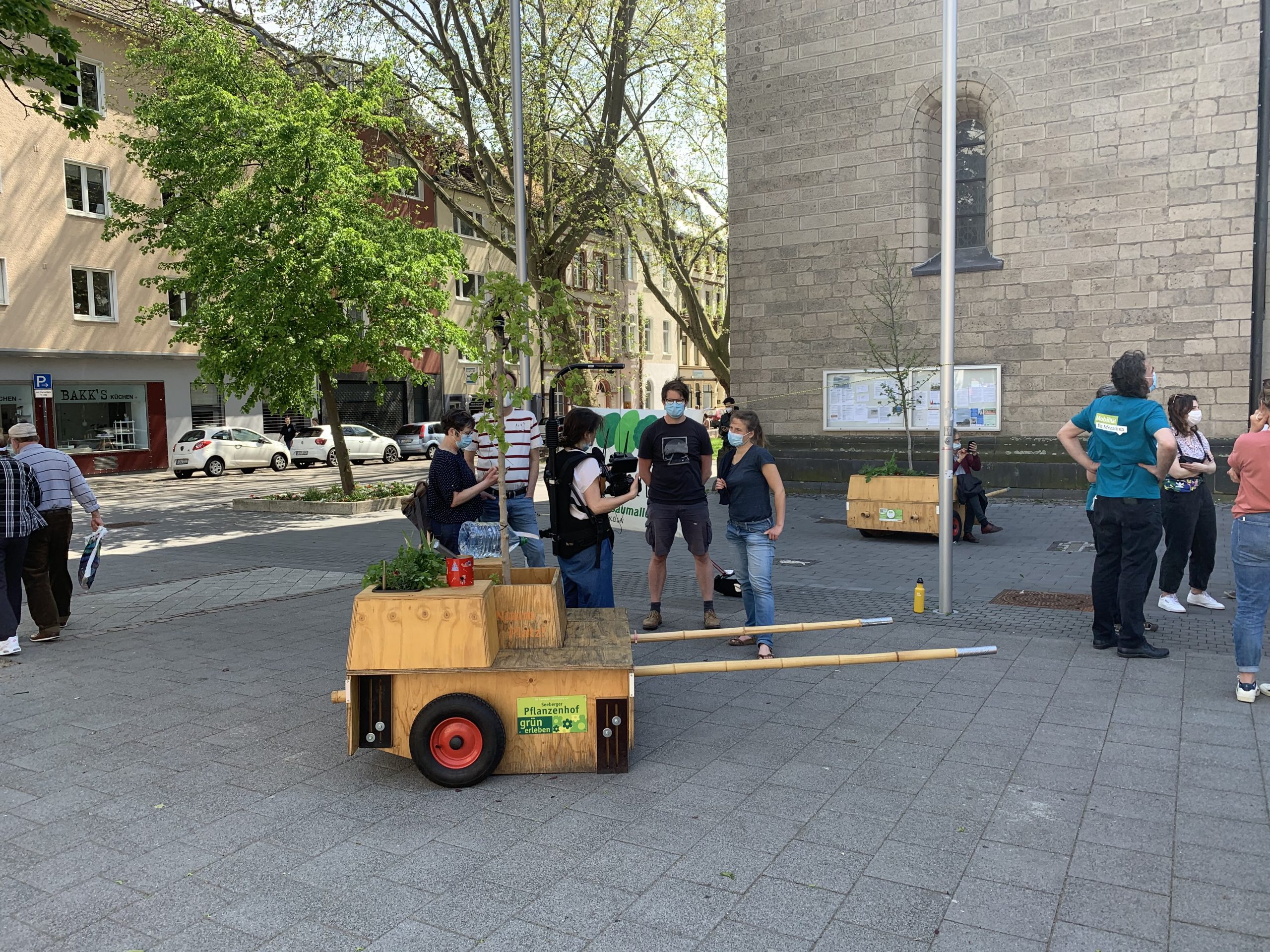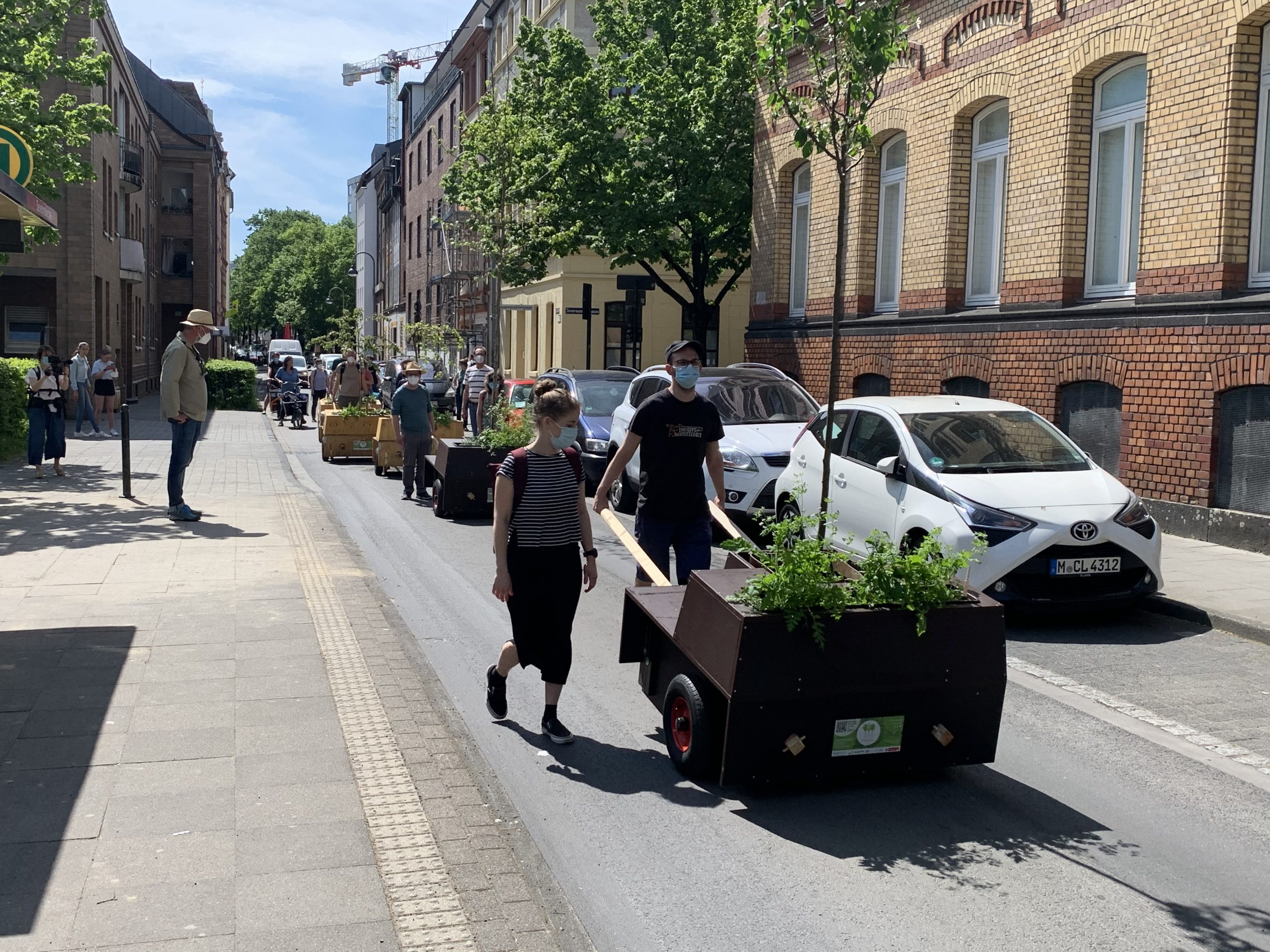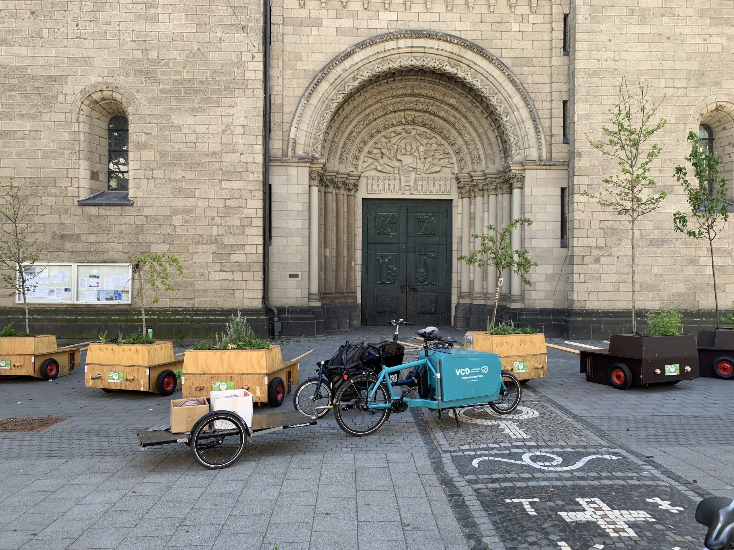 Bei bestem Wanderwetter (Sonne, wenig Wind — wie könnte es anders sein) trafen sich Helfer*Innenaus Deutz und Wanderbaumfreund*Innen in der Südstadt und zogen mit den sechs Wanderbäumen unter der Severinsbrücke hindurch, über den Heumarkt und die Deutzer Brücke zur Deutzer Freiheit. Bei relativ wenig Verkehr verlief die Wanderung — einem sonnigen Spaziergang gleich — sehr angenehm ruhig. Zwischenstopp vor St. Heribert: Wer wandert, muss sich auch stärken, u.a. mit kühlem Nass aus dem neuen Trinkwasserspender der Stadt (https://www.stadt-koeln.de/politik-und-verwaltung/presse/mitteilungen/22136/index.html). Hier stießen Vertreter*Innen aus Politik und Stadtgesellschaft dazu. Zum Auftakt des Greening-Month hielten Anne (Greening Month Projekt), Ralph Herbertz für die Initiative WBA / VCD Köln und Bezirksbürgermeister Innenstadt Andreas Hupke kurze Ansprachen. Schließlich trat die Wandergruppe die letzte Etappe an, um die Wanderbäume auf ihre Standorte in der Tempelstraße / Ecke Adolphstraße, in der Mathildenstraße sowie in der Suevenstraße zu verteilen, wo jeweils zwei Baummodule bis zum 20. Juni stehen werden.