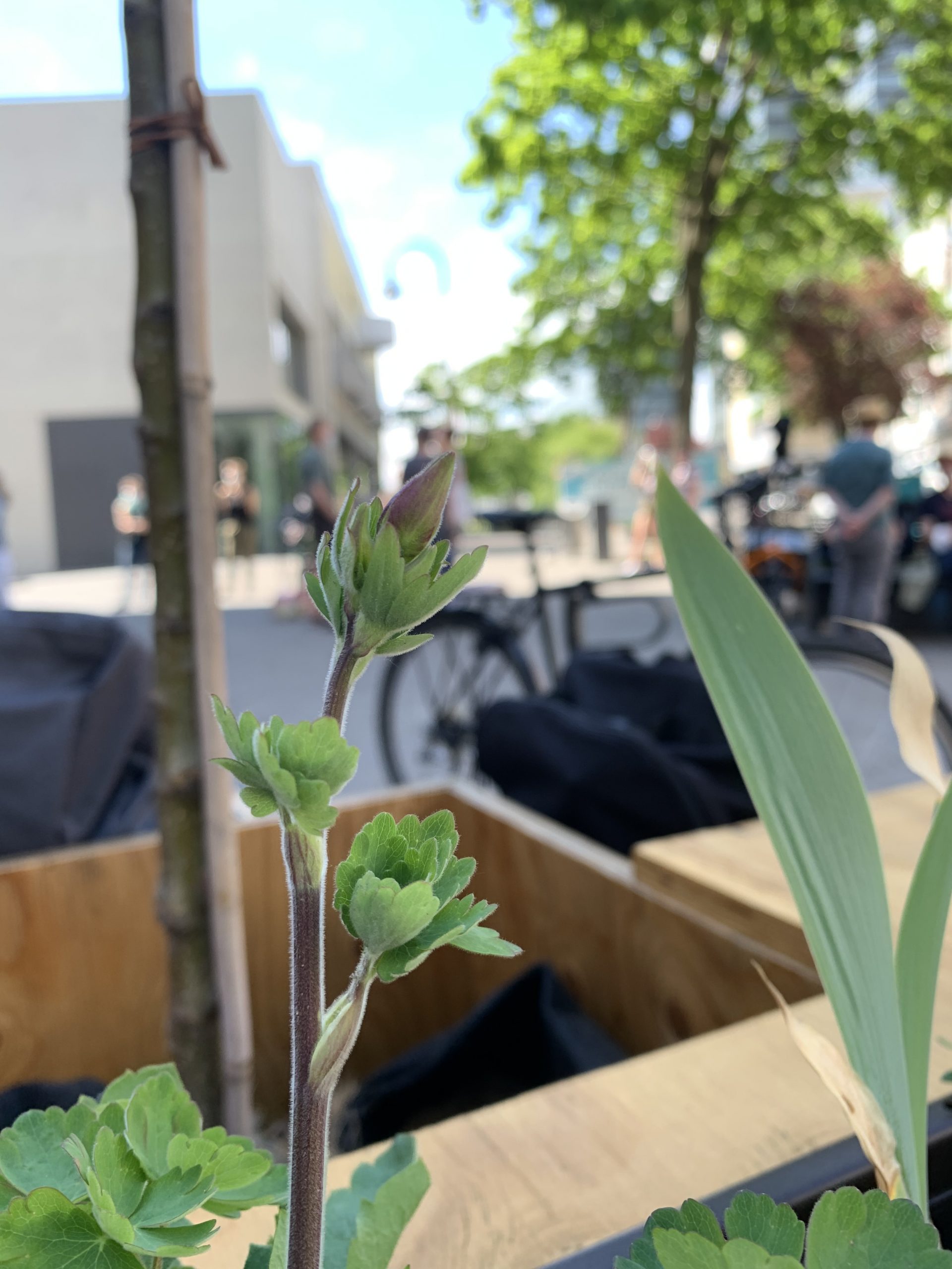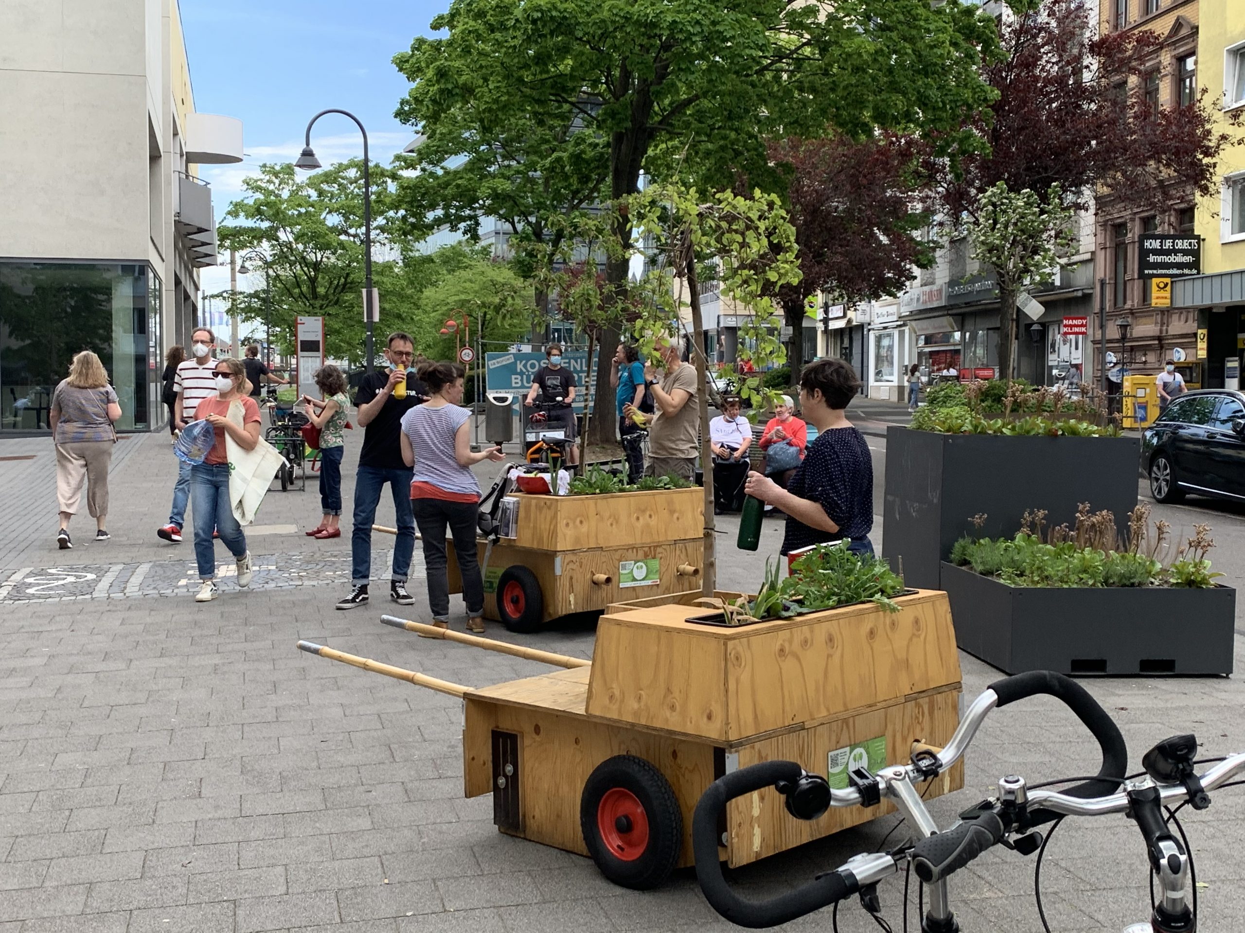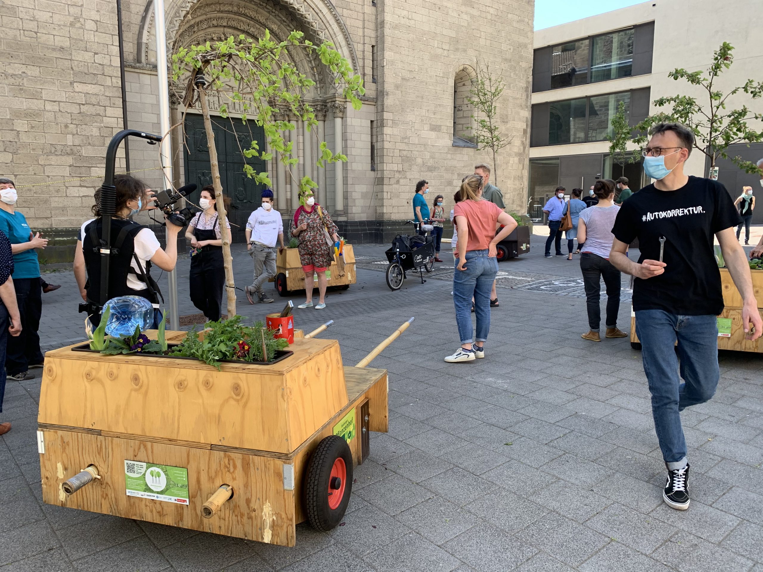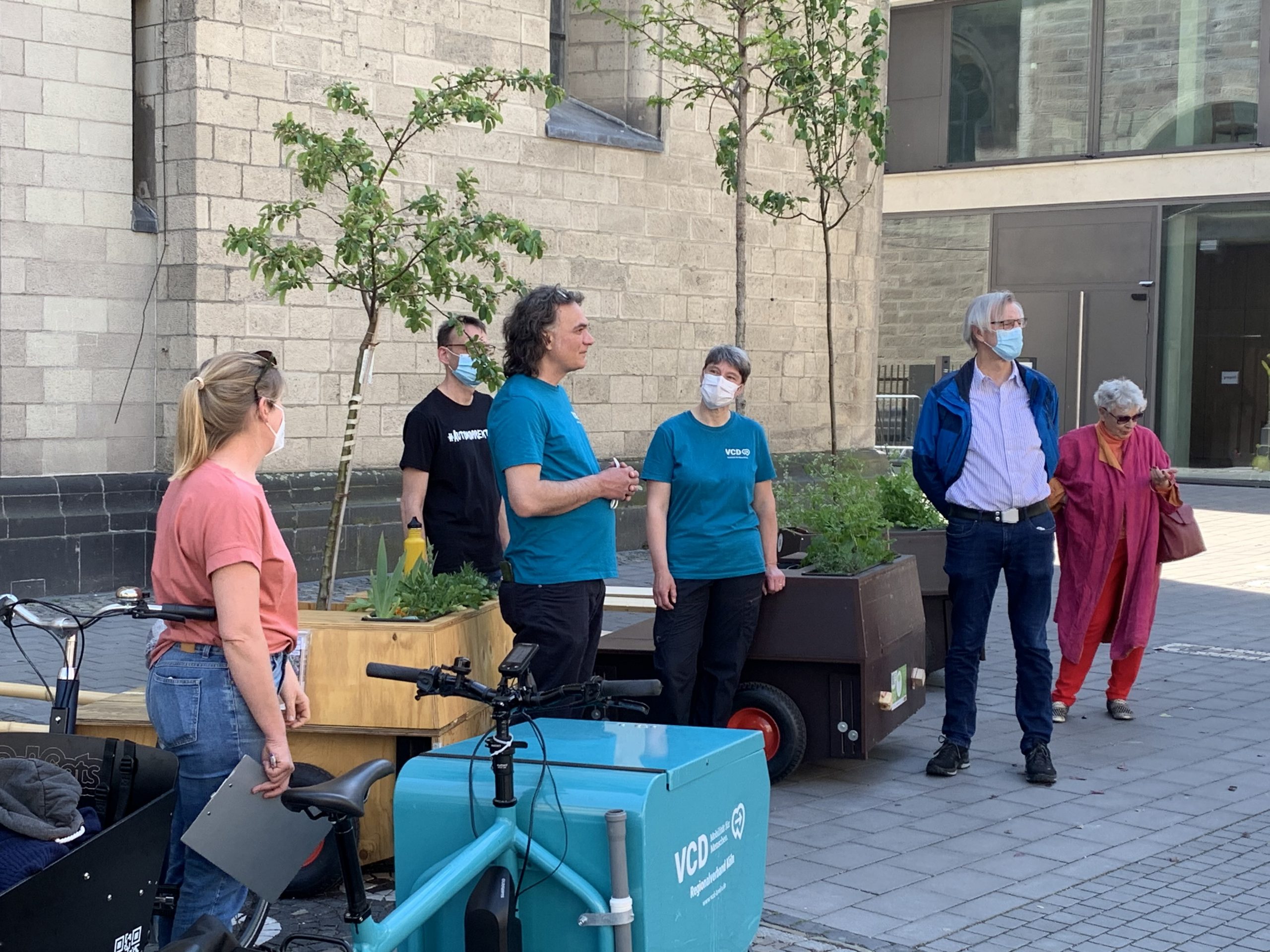 Bei bestem Wanderwetter (Sonne, wenig Wind — wie könnte es anders sein) trafen sich Helfer*Innenaus Deutz und Wanderbaumfreund*Innen in der Südstadt und zogen mit den sechs Wanderbäumen unter der Severinsbrücke hindurch, über den Heumarkt und die Deutzer Brücke zur Deutzer Freiheit. Bei relativ wenig Verkehr verlief die Wanderung — einem sonnigen Spaziergang gleich — sehr angenehm ruhig. Zwischenstopp vor St. Heribert: Wer wandert, muss sich auch stärken, u.a. mit kühlem Nass aus dem neuen Trinkwasserspender der Stadt (https://www.stadt-koeln.de/politik-und-verwaltung/presse/mitteilungen/22136/index.html). Hier stießen Vertreter*Innen aus Politik und Stadtgesellschaft dazu. Zum Auftakt des Greening-Month hielten Anne (Greening Month Projekt), Ralph Herbertz für die Initiative WBA / VCD Köln und Bezirksbürgermeister Innenstadt Andreas Hupke kurze Ansprachen. Schließlich trat die Wandergruppe die letzte Etappe an, um die Wanderbäume auf ihre Standorte in der Tempelstraße / Ecke Adolphstraße, in der Mathildenstraße sowie in der Suevenstraße zu verteilen, wo jeweils zwei Baummodule bis zum 20. Juni stehen werden.